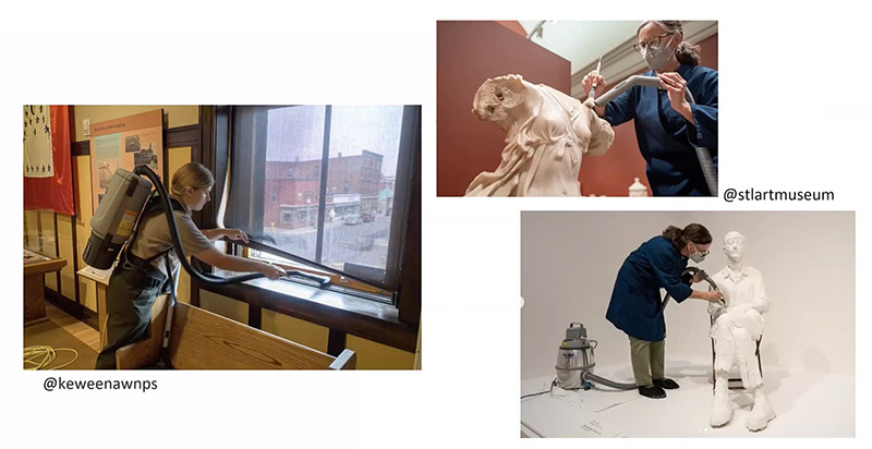 Museums and cultural institutions should use HEPA-filtered vacuum cleaners to ensure their housekeeping efforts aren't releasing more dust back into their spaces. Presentation slide courtesy of Dyani Feige.