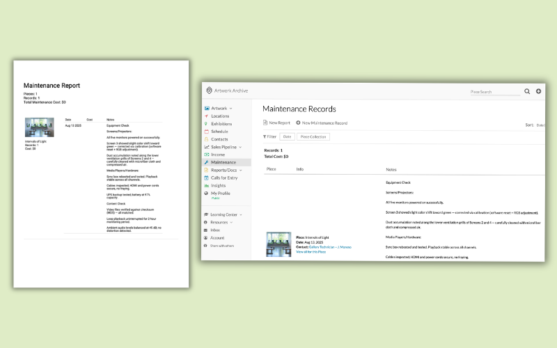 Keeping maintenance records in messy spreadsheets or—even worse—on perishable paper forms is a recipe for lost information. With Artwork Archive, you can create a Maintenance Record of every event, and generate Maintenance Reports to see a full history of an object's care.