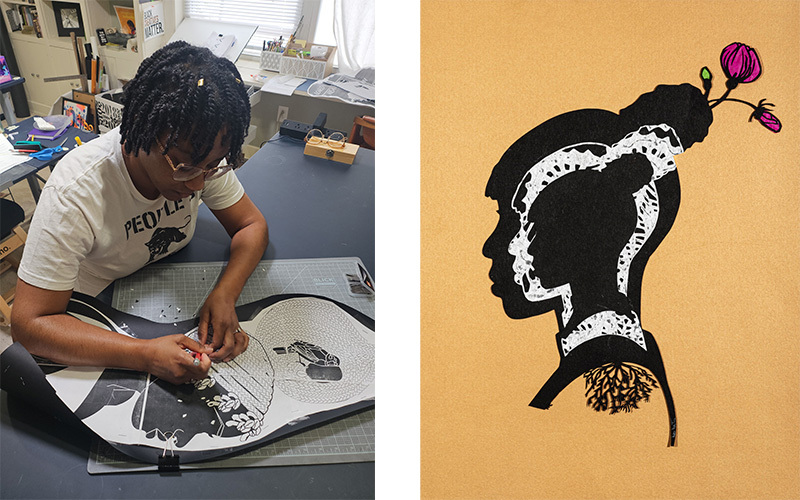 Janelle Washington working in her Richmond, Virginia studio, and Wild Weed, 2021, Cut Paper with Tissue Paper infills, Framed: 22 x 18 x 0.25 in. Image courtesy of the artist.