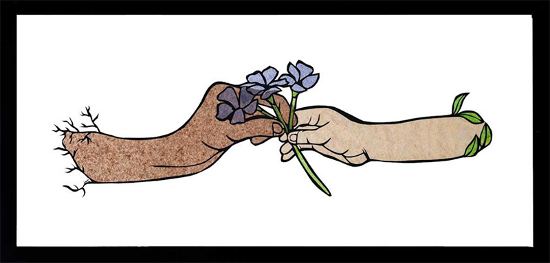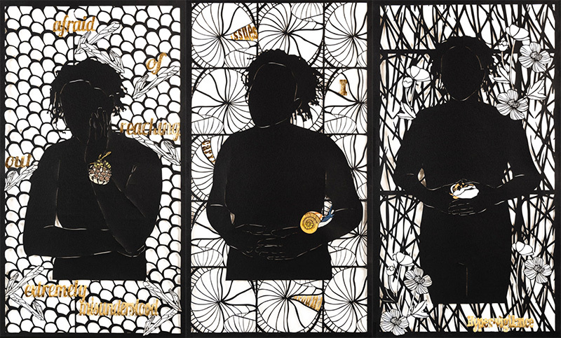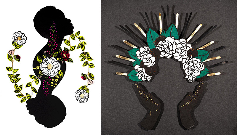 “I work with positive and negative space, silhouette, and Adinkra symbols”—symbols rife with meaning that have been used by the Akan people of Ghana for several centuries. She cuts her main image from black Fabriano Tiziano paper, and often embellishes with “thread, gold leaf, painted backgrounds, and tissue paper infills to reflect the shades of melanin and add a contemporary perspective to my paper-cut designs.”
