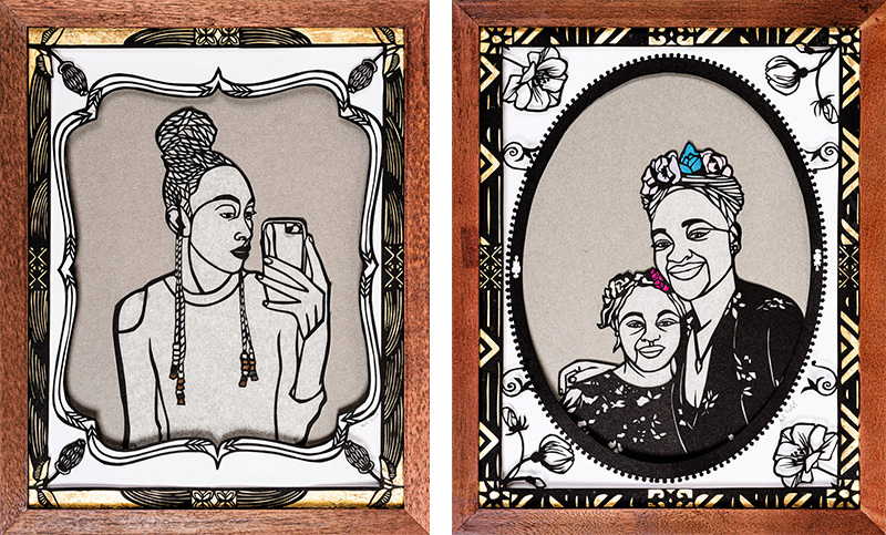 Janelle Washington, Young Adult, 2018, Painted paper cut art with colored paper inserts, Framed: 17 x 11 in, and Mother and Daughter, c. 2018, Cut Paper with Tissue Paper infills, Framed: 17 x 11 in.