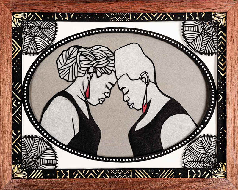 Janelle Washington, Sisters, c. 2018, Painted paper cut art with colored paper inserts, Framed: 11 x 17 in.