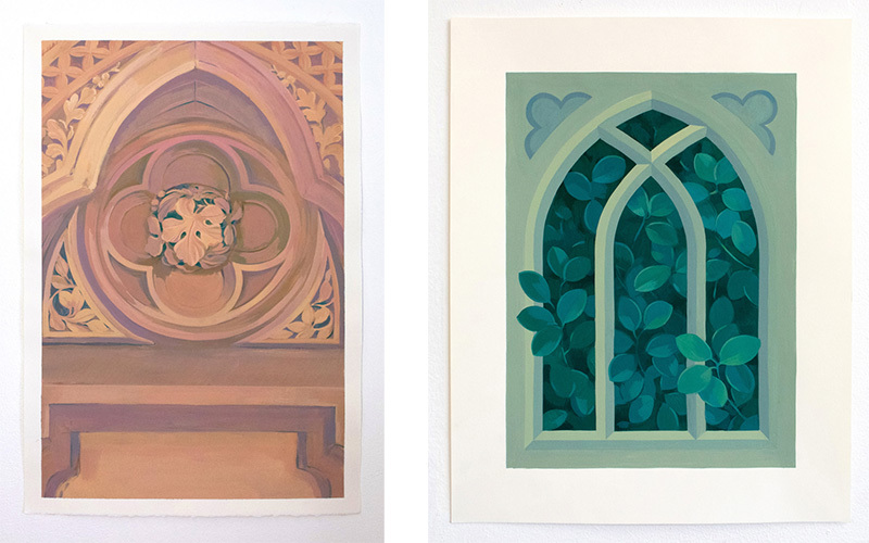 Lucía Rodríguez Pérez, Untitled (neogothic chapel, niche study), 2025, gouache on paper, and Untitled (window), 2024, gouache on paper.