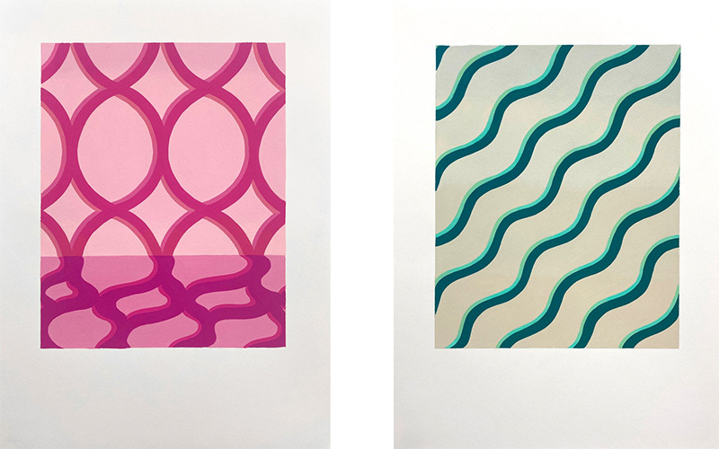 Lucía Rodríguez Pérez, Untitled (rose fence), 2023, gouache on paper, and Untitled (teal waves), 2023, gouache on paper.