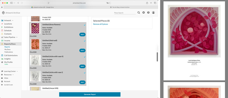 When Lucía needs to let her gallery or a potential collector know which art she currently has available, she can quickly select the pieces she wants to include and generate a professional PDF report to share in minutes. Learn how Artwork Archive's Reports can simplify your art business admin, then give them a try with a 14-day free trial today.