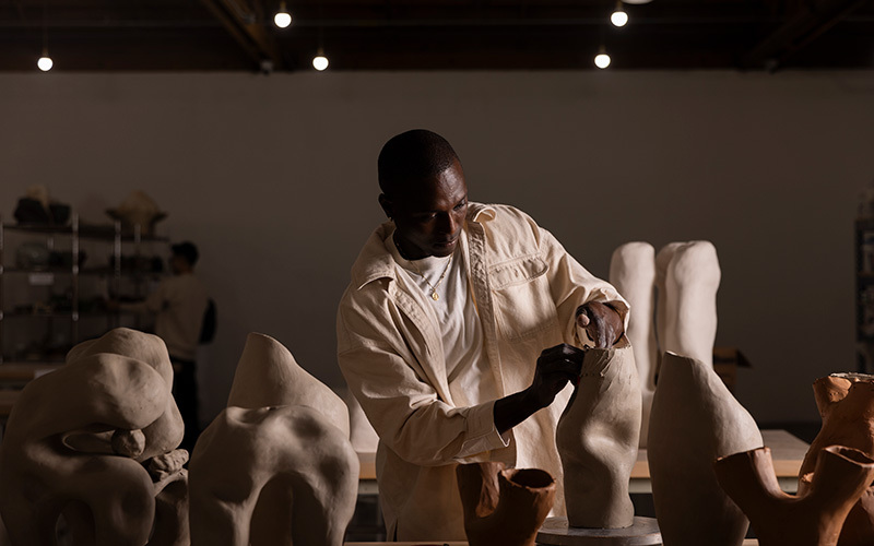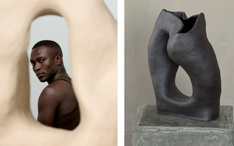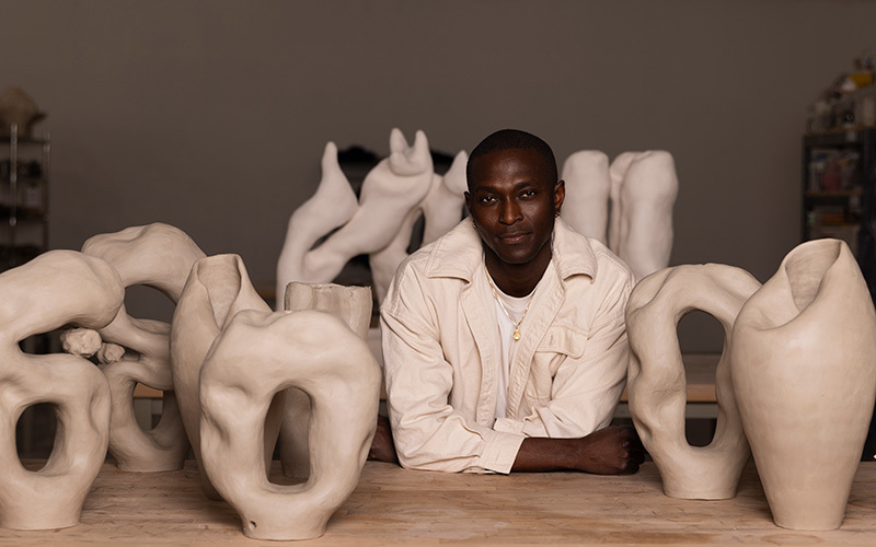 Featured Artist Mohamed Ouedraogo creates ceramic objects inspired by the curves and wrinkles of the human body. Photo by Maxwell Poth.