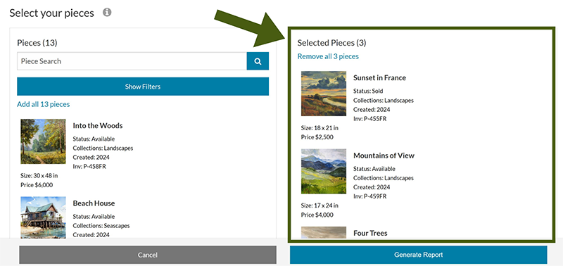 With the Inventory Report feature, he can create a professional PDF to send to galleries, collectors, and clients as soon as they express interest. Want to see how easy it is? Try it for yourself for free for 14 days.