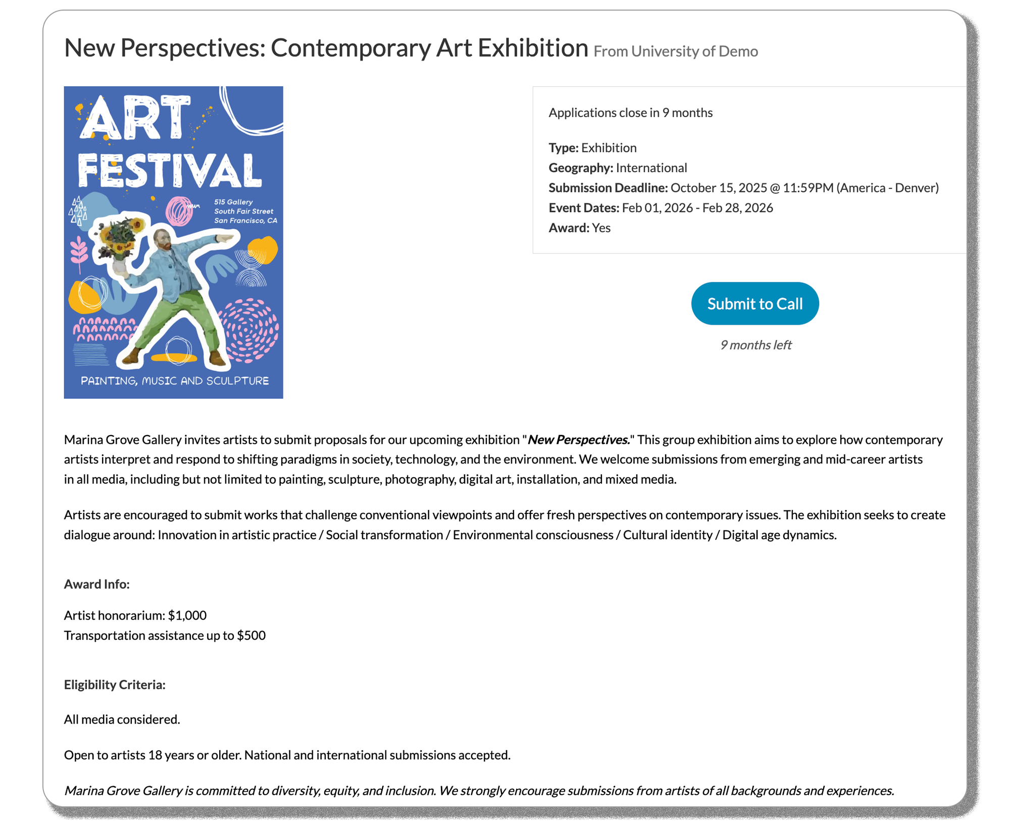 - Manage exhibitions, competitions, grants, and residencies in one place