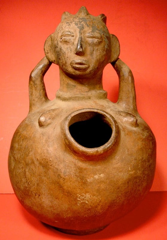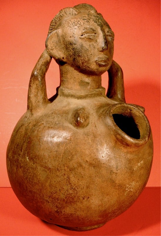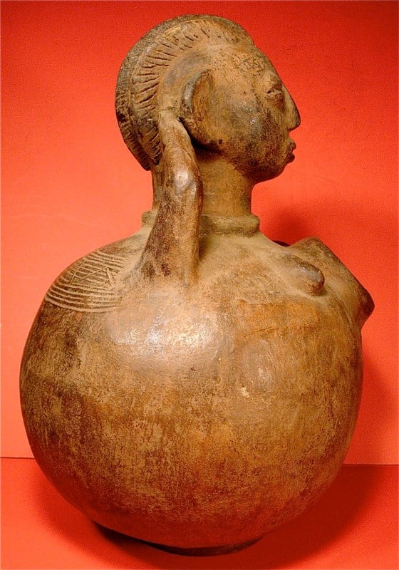 African potters--primarily women--handbuild a variety of vessels that they embellish with beautiful colors, designs and motifs before firing them at low temperatures. Containers made for daily use hold water or serve as cooking utensils. They also make vessels to be used in special ceremonies or that become part of an assemblage of objects placed in a shrine. The figurative pottery tradition arose in northeastern Congo during the late 19th century when the Zande and Mangbetu produced works for Europeans and Africans. Vessels, such as this example, were black or near black in color with highly burnished surfaces. The deep, incised grooves that appear as concentric circles on the body and as parallel grooves on the neck display Mangbetu influence. The stylized head with protruding, perforated ears, elongated jutting nose with flared nostrils and half-closed eyes in large sockets are reminiscent of Zande stylistic traits. The impressed patterns that appear on the body and neck are found on both Zande and Mangbetu pottery. While both Zande men and women create pottery, only Zande men created figurative pottery, a tradition no longer exists.