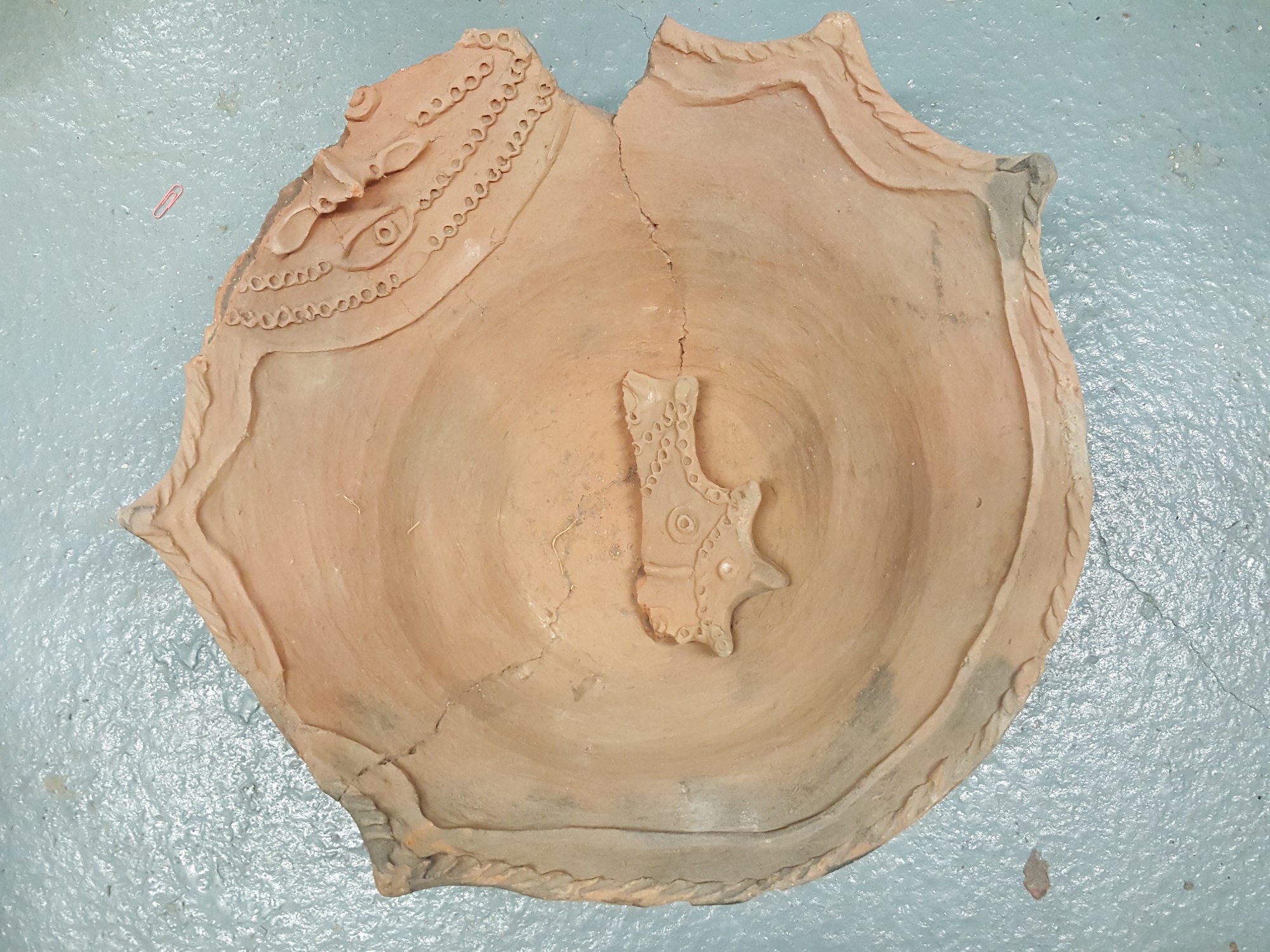 These clay containers are from the Aibom Village. The pots have clay relief faces of ancestral beings. The clay detail is highlighted with white and black ochre. These pots were collected in the 1960’s. Aibom village is on the edge of the inland lake system in the middle Sepik called the Chambri Lakes. The area can only be reached by canoe that can travel the narrow water ways choked by logs and floating islands of grass. Its isolation and inaccessibility accounted for the lateness of European contact, in contrast to the middle Sepik villages. Aibom pottery was and still is a precious item of exchange. Sago and fish form the stable diet of the Aibom people and in order to secure sago which they do not gather or process themselves they rely on trade with the bush people living in the hill country behind the lakes and villages of the middle Sepik.