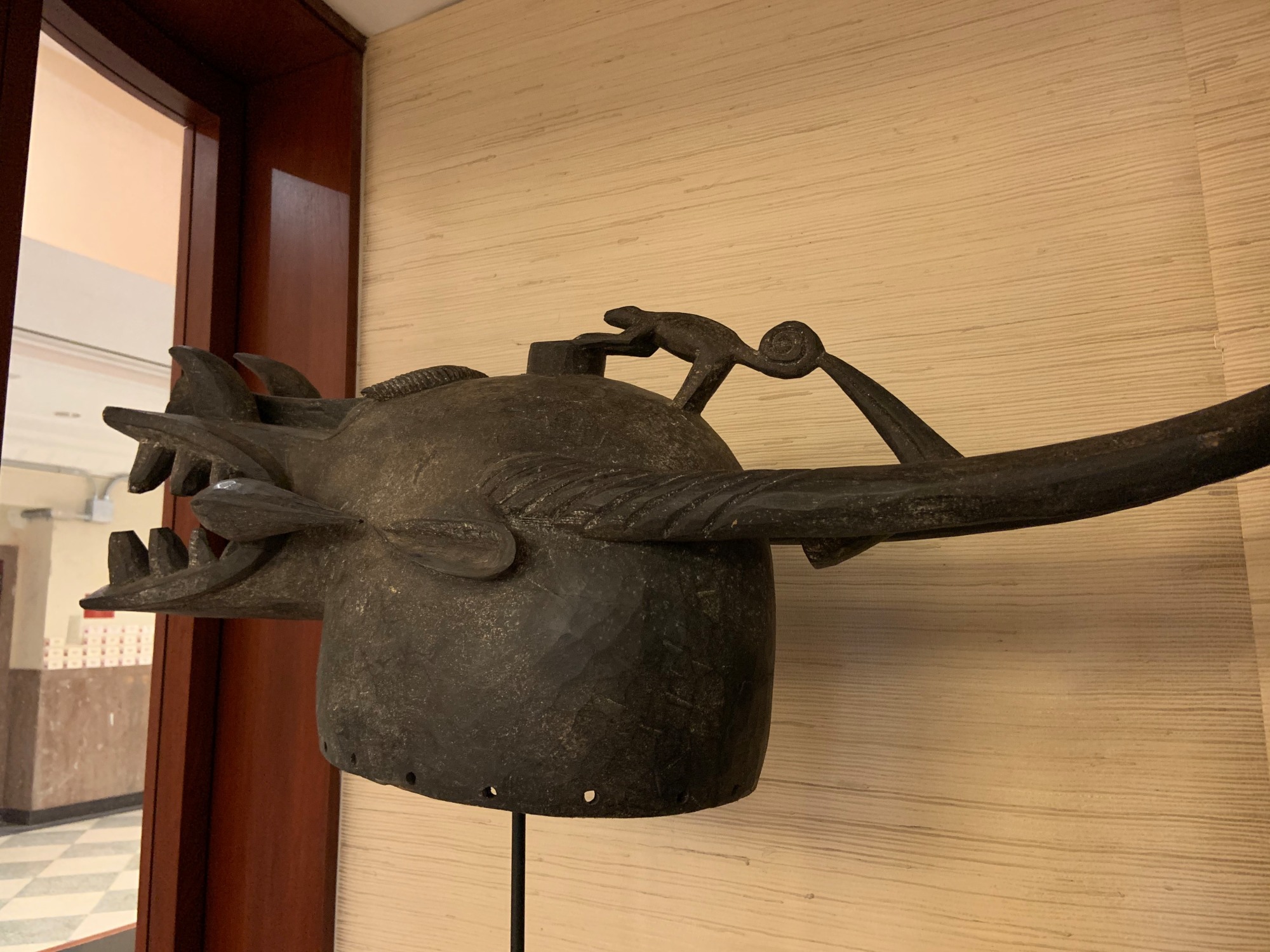 Kponyungo masks are used by male Poro members at funerals wearing baggy, mud-dyed costumes. The Poros portray powerful spirits escorting the deceased to the other world, thus protecting the community from supernatural danger. The main features of these masks are the eyes, large mouth, and ferocious teeth of a crocodile; the snout of a hyena; the twisted horns of a ram; and the slender, arcing horns of an antelope.