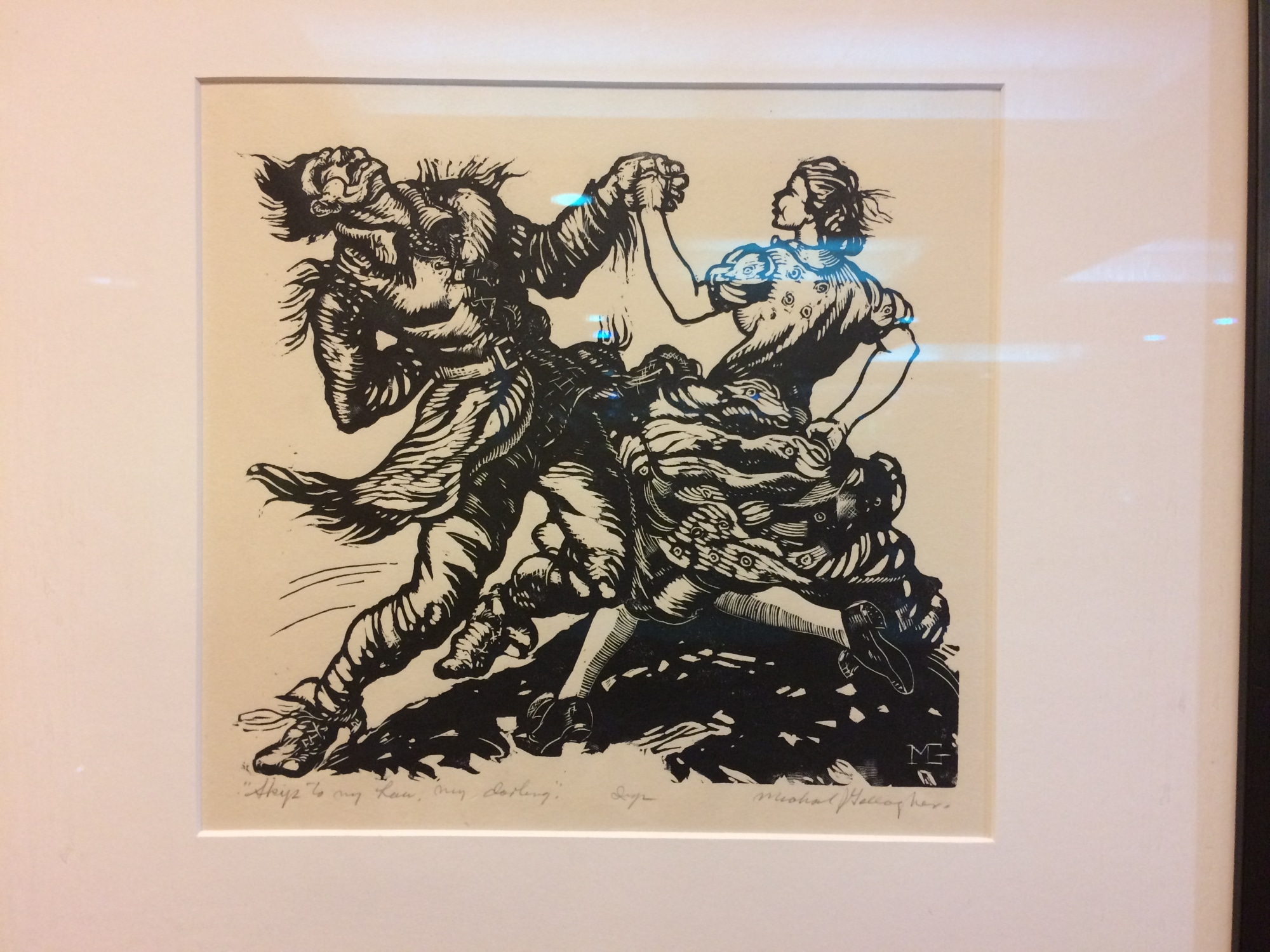 Michael J. Gallagher (1898-1965) was a sickly boy in a family of Irish Pitmen in Scranton PA and he was never employed in the mines. He joined up for WW1, shipped out - and contracted TB at boot camp. He was sent to a sanatorium to convalesce. He drew to amuse himself and a doctor was so impressed with his talent that he gave him all the materials he needed and recommended art school. He moved to New York City, worked as a bell hop and took etching classes at the Art Students League. From there he went to Philadelphia to the School of Industrial Arts. He was offered the job of technical director of the Philadelphia Printmaking branch of the WPA art project.