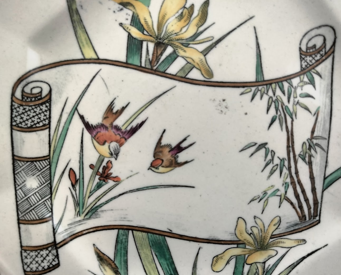 Plate, 9 x 9 inches. Black transfer with polychrome clobbering. Impressed maker's mark for W. T. Copeland & Sons and an impressed datemark for September 1891. The red painted pattern number 2/428 belongs to a series introduced in 1876. This pattern features an unfurled Japanese horizontal scroll (emakimono) filled with a scene of two songbirds flying above wild irises growing out the water with bamboo stalks to the right. This scroll is superimposed over yellow irises and a butterfly in flight.