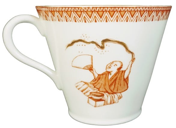 Tea cup and saucer, unknown dimensions. No maker's mark, but the pattern number is the same as one produced by E. F. Bodley & Co. This pattern features Japanesque motifs placed evenly around the cup and saucer: human figures, animals, foliage, vases, and fans. The simple border consists of simple repeated concentric triangles and a meander.
