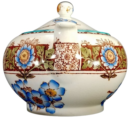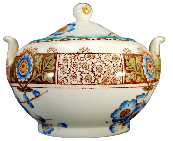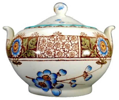 Sugar Bowl, 3.75 inches tall. Brown transfer with polychrome clobbering. Printed mark for Wedgwood and painted pattern number in red. Each variation of this pattern has a different painted pattern number. The pattern consists of a single spray of blue flowers with green palm leaves centered in the plate. A narrow geometric band is at the outermost edge of the plate with a wide band of repeating brown and cream circle sections infilled with a blue flower and leaves in the brown sections. Leaves only are found in the cream colored sections.