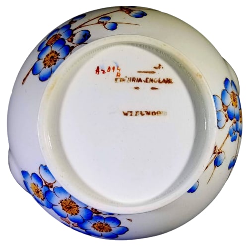 Sugar Bowl, 3.75 inches tall. Brown transfer with polychrome clobbering. Printed mark for Wedgwood and painted pattern number in red. Each variation of this pattern has a different painted pattern number. The pattern consists of a single spray of blue flowers with green palm leaves centered in the plate. A narrow geometric band is at the outermost edge of the plate with a wide band of repeating brown and cream circle sections infilled with a blue flower and leaves in the brown sections. Leaves only are found in the cream colored sections.