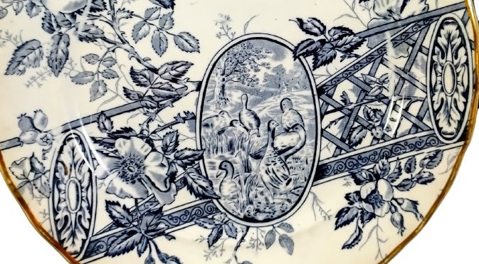 Plate, 9.25 inches diameter. Black transfer with gilding. Printed maker's mark for Grimwade Bros. The registration number "108552" dates the pattern registration to 1888. The pattern includes a central cartouche of a group of waterfowl near a pond with a cottage, basket-weave fence, and woods beyond. Beneath the cartouche is a wooden trellis with wild roses climbing on, above, and below it. Framing the trellis are decorative roundels in a Renaissance style. Winkle & Wood of the Colonial Pottery in Hanley, produced the same Adelaide pattern, also with Rd. No. 108552. This probably means that the Rd. No. is attached to the pattern name.