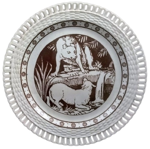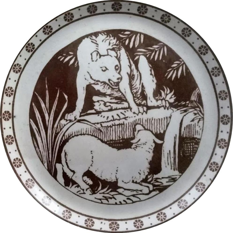Plate, 9 inches diameter. Brown transfer. Impressed maker's mark for Mintons. This pattern comes from a series of twelve Aesop's Fables produced by Mintons China Works for tiles. Both Mintons and Wedgwood extended the use of their tile patterns by incorporating them onto plates and other pieces in a dinner service. This pattern represents the fable "The Wolf and the Lamb."