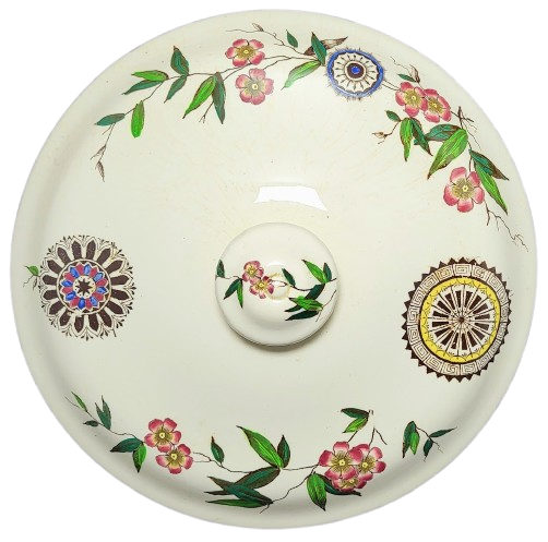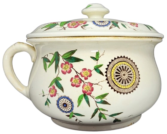Chamber pot, 11 x 8.75 x 7.5 inches. Black transfer with polychrome clobbering. Printed maker's mark for Ralph Hammersley & Son. Painted pattern number "1350." The impressed "5/84" indicates a form manufacture date of 1884. This pattern features circular cartouches filled with radiating forms and geometric designs placed amongst trailing vines of lanceolate leaves and five-petalled flowers. The border around the body rim and handle consists of a geometric patchwork of hatched shapes.