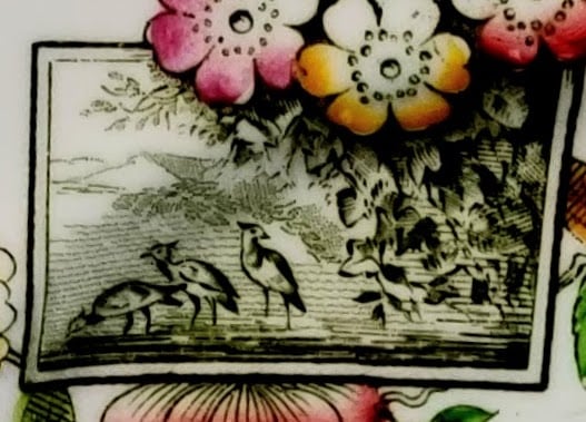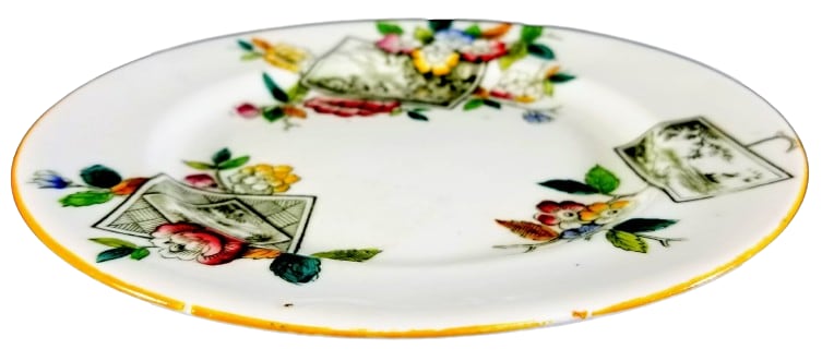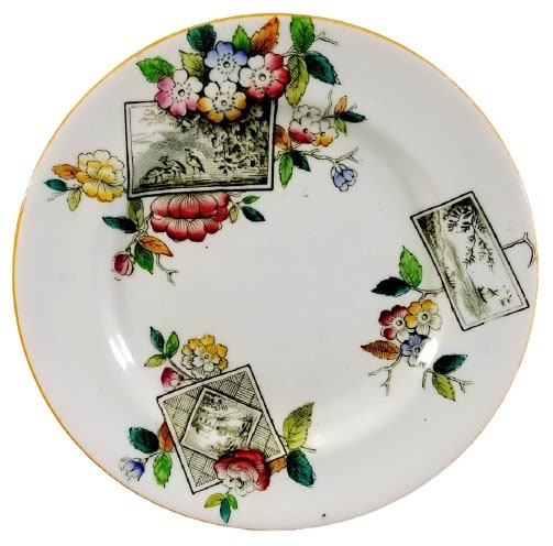 Plate, 7.25 inches diameter. Black transfer with polychrome clobbering. Printed maker's mark for William Alsager Adderley & Co. The registration number "153" dates this pattern registration to 1884. The hand-painted pattern number, "4/1343," denotes the colors used over the glaze. The pattern consists of three cartouches framed by blooming flowers in pink, orange, and blue with green leaves. The large rectangular cartouche consists of a simple line border and features three birds standing in water with tree branches hanging down and mountains in the background. The smaller rectangular cartouche has the same line border and contains an asymmetrical scene of a man in a sailboat under flying birds and a grassy shoreline with trailing leafy branches. The square cartouche features a cottage in the countryside within a geometric parquet pattern. A simple yellow painted line covers the rim of the plate.