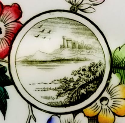 Plate, 7.25 inches diameter. Black transfer with polychrome clobbering. The "Rd. No. 153" dates this pattern registration to 1884. The hand-painted pattern number "4/1343", indicates the colors over the glaze. The pattern consists of three cartouches framed by blooming flowers in pink, orange, and blue with green leaves. The large rectangular cartouche consists of a simple line border and features a village scene with a man and a cat and two children playing in the foreground. The circular cartouche has the same line border and contains a water scene with plants in the foreground and a castle in the hills with birds flying above in the background. The square cartouche features a cottage in the countryside within a geometric parquet pattern. A simple yellow painted line covers the rim of the plate.