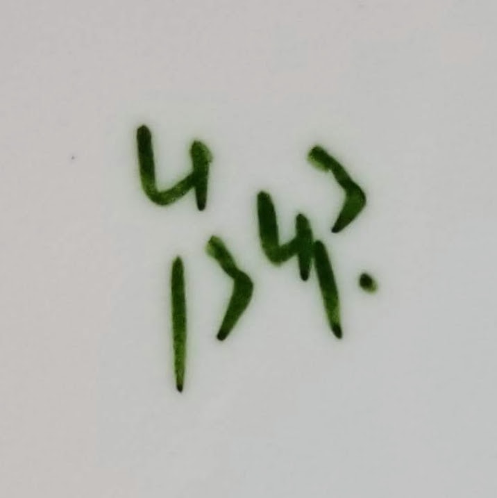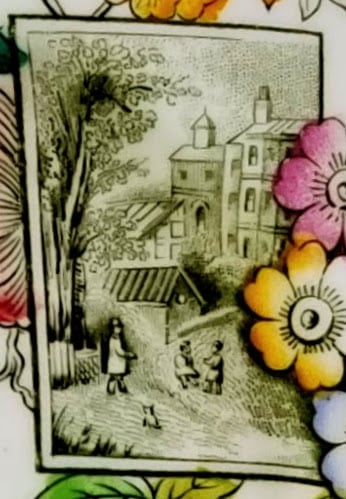 Plate, 7.25 inches diameter. Black transfer with polychrome clobbering. The "Rd. No. 153" dates this pattern registration to 1884. The hand-painted pattern number "4/1343", indicates the colors over the glaze. The pattern consists of three cartouches framed by blooming flowers in pink, orange, and blue with green leaves. The large rectangular cartouche consists of a simple line border and features a village scene with a man and a cat and two children playing in the foreground. The circular cartouche has the same line border and contains a water scene with plants in the foreground and a castle in the hills with birds flying above in the background. The square cartouche features a cottage in the countryside within a geometric parquet pattern. A simple yellow painted line covers the rim of the plate.