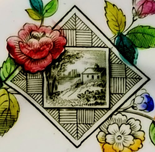 Plate, 7.25 inches diameter. Black transfer with polychrome clobbering. The "Rd. No. 153" dates this pattern registration to 1884. The hand-painted pattern number "4/1343", indicates the colors over the glaze. The pattern consists of three cartouches framed by blooming flowers in pink, orange, and blue with green leaves. The large rectangular cartouche consists of a simple line border and features a village scene with a man and a cat and two children playing in the foreground. The circular cartouche has the same line border and contains a water scene with plants in the foreground and a castle in the hills with birds flying above in the background. The square cartouche features a cottage in the countryside within a geometric parquet pattern. A simple yellow painted line covers the rim of the plate.