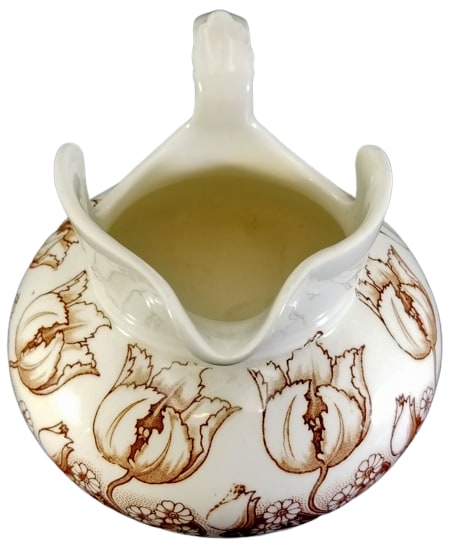 Pitcher, printed in brown. F. Winkle & Co. printed maker's mark and the lack of "England" dates this pattern to c. 1890. The style of this floral pattern looks like a bridge between the Aesthetic Movement and Art Nouveau. The latter movement only lasted from roughly 1890 to 1910, but was characterized by long, sinuous, organic lines and a focus on the natural world. The "Alton" pattern fits this definition neatly. It consists of an alternating row of sinuous large and small tulips, interspersed with groupings of daisy blooms and stylized flowers on stems.
