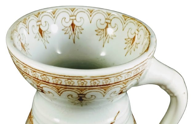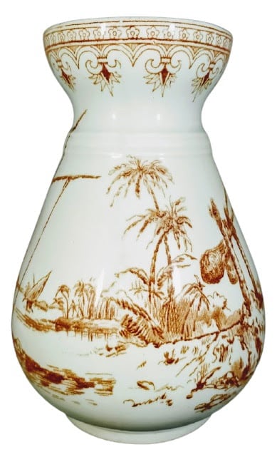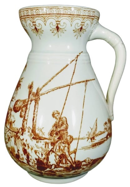 Pitcher, 7 inches tall. Printed maker's mark for Powell & Bishop. The registry diamond dates the registration of this pattern to 24 March 1877. This design shows two people operating a shadoof, an irrigation device with a bag or basket on one end and a counterweight on the other, used to lift water from a river or lake to the fields. It was used in ancient Mesopotamia and is still used in many parts of Asia and Africa today. It is perhaps best known in Egypt.