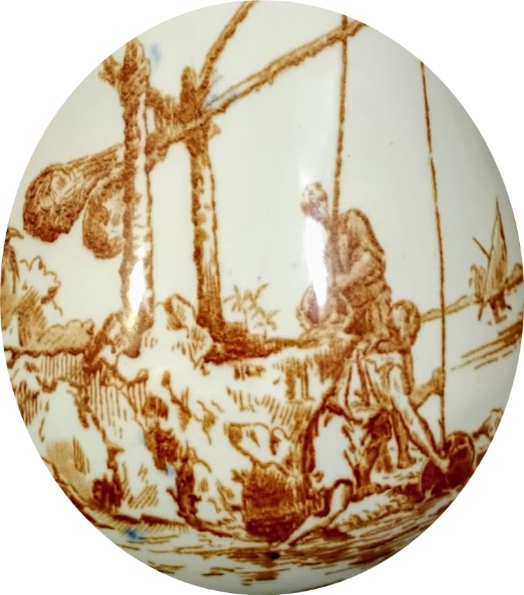 Pitcher, 7 inches tall. Printed maker's mark for Powell & Bishop. The registry diamond dates the registration of this pattern to 24 March 1877. This design shows two people operating a shadoof, an irrigation device with a bag or basket on one end and a counterweight on the other, used to lift water from a river or lake to the fields. It was used in ancient Mesopotamia and is still used in many parts of Asia and Africa today. It is perhaps best known in Egypt.