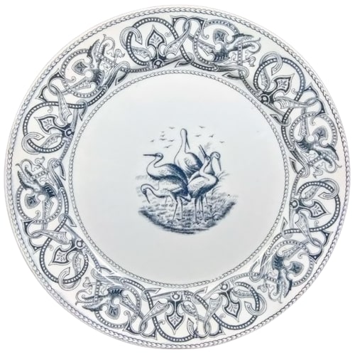 Plate, 8.75 inches diameter. Black transfer. Printed and impressed maker's marks for James Edwards & Son. The registry diamond dates the registration of this pattern to 17 July 1877. This very unusual pattern contains two disparate stylistic elements, but the registration date and central motif indicate it is an example of the Aesthetic style. The central motif is a Japanesque grouping of five cranes in a field. The border, however, consists of a Celtic-inspired chain of interlocking geometric and zoomorphic elements. Although an odd pairing, the Victorian interest in Asian art forms and European art styles of the past, including Celtic, embody the eclecticism of the Aesthetic Movement.