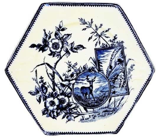 Hexagonal plate, 8.625 x 8.625 inches. Blue transfer. Maker is F. J. Emery. This pattern features two cartouches laid over branches of wild roses and seeded grasses. The rectangular cartouche features a river canyon scene with a waterfall and the circular cartouche features a stage standing in a grassy landscape with rolling hills in the background. The border consists of two narrow bands of repeated triangles and dots.