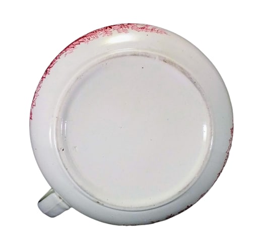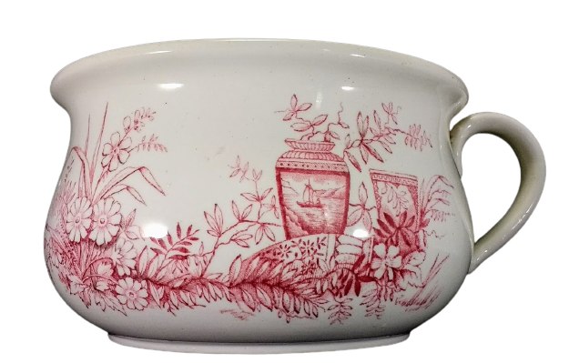 Chamber pot, 8 x 8 x 4.75 inches. Red transfer. Printed maker's mark for G. W. Turner & Sons. The sides of the body feature a large urn with a sailing vessel pictured on the front. There is a man in the boat and a lake and mountains are seen in the distance. The vase itself has a half-hearted vine drifting out of the top. Next to it on the right is a lop-sided pot with a leaf motif and laying on its side is a third vase, half buried in foliage. The side opposite the handle features a circular cartouche sectioned and filled with stylized geometric and floral patterns.