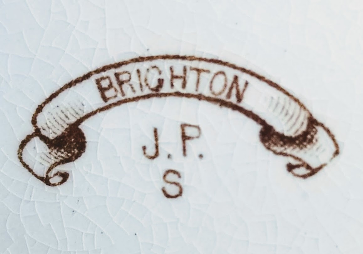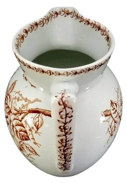 Pitcher, 11 inches tall. Maker unknown at this time, but the J. P. could be James Plant of Registry Street, Stoke. He operated c. 1880-1888. This pitcher features a different image on either side. Superimposed over a trailing branch of plums, one side features a large cartouche. The cartouche has a thick border filled with a variety of designs, including the Japanese seigaha (wave crest) design. Inside the cartouche, 1/3 of the space is filled with a diagonal band of geometric lines and circles. The rest of the space is filled with a lakeside scene: a tree-lined shore, sailboats, and mountains in the distance. Jutting from the left of the cartouche is a three-dimensional block decorated with flowers. The other side of the pitcher features a similar scene. Superimposed over a trailing branch of gooseberries, is another large cartouche. This cartouche features a large border filled with geometric designs, including one that resembles snake scales. Inside the cartouche, 1/3 of the space is filled with a vertical band of geometric and organic designs. The rest of the cartouche features another lakeside scene: a tree-lined shore with a solitary figure and gently rolling hills in the distance. The front of the pitcher is decorated with a clump of hazelnuts. The border, seen on the handle and around the outer and inner rim of the pitcher is a band of cherries. Below the rim border on both sides is a small patch of blackberries.