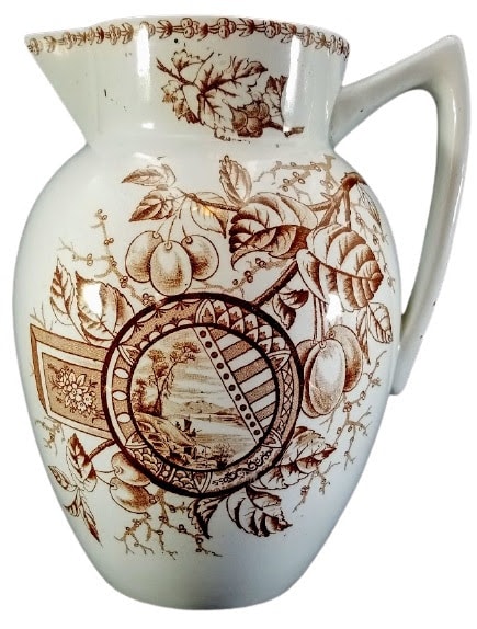 Pitcher, 11 inches tall. Maker unknown at this time, but the J. P. could be James Plant of Registry Street, Stoke. He operated c. 1880-1888. This pitcher features a different image on either side. Superimposed over a trailing branch of plums, one side features a large cartouche. The cartouche has a thick border filled with a variety of designs, including the Japanese seigaha (wave crest) design. Inside the cartouche, 1/3 of the space is filled with a diagonal band of geometric lines and circles. The rest of the space is filled with a lakeside scene: a tree-lined shore, sailboats, and mountains in the distance. Jutting from the left of the cartouche is a three-dimensional block decorated with flowers. The other side of the pitcher features a similar scene. Superimposed over a trailing branch of gooseberries, is another large cartouche. This cartouche features a large border filled with geometric designs, including one that resembles snake scales. Inside the cartouche, 1/3 of the space is filled with a vertical band of geometric and organic designs. The rest of the cartouche features another lakeside scene: a tree-lined shore with a solitary figure and gently rolling hills in the distance. The front of the pitcher is decorated with a clump of hazelnuts. The border, seen on the handle and around the outer and inner rim of the pitcher is a band of cherries. Below the rim border on both sides is a small patch of blackberries.