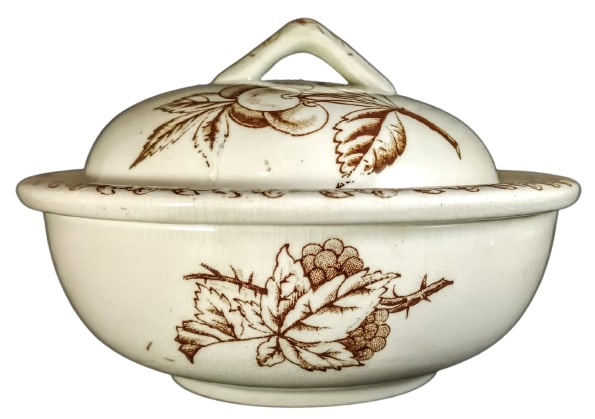 Soap Dish, 5.5 x 5.5 x 3 inches. Maker unknown at this time, but the J. P. could be James Plant of Registry Street, Stoke. He operated c. 1880-1888. This pattern features fruit. The body of the soap dish features blackberries on thorny branches, while the lid features a sprig of cherries and a lone blackberry hiding behind spiky leaves. The border, seen on the insert rim and the lid handle, is a band of cherries.
