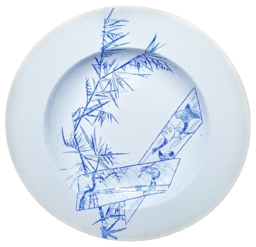 Soup plate, 9.5 inches diameter. Blue transfer. Printed and impressed maker's marks for Brown-Westhead, Moore & Co. The impressed registry diamond indicates a manufacture date of 23 January 1875. "Burmese" is a series of patterns characterized by cartouches filled with copies of Japanese art, especially woodblock prints. Here two parallelogram cartouches are laid over a branch of bamboo. One cartouche features an image of a Japanese man crossing a footbridge in the rain and the other features geese in flight.