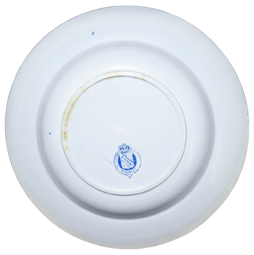 Soup plate, 9.5 inches diameter. Blue transfer. Printed and impressed maker's marks for Brown-Westhead, Moore & Co. The impressed registry diamond indicates a manufacture date of 23 January 1875. "Burmese" is a series of patterns characterized by cartouches filled with copies of Japanese art, especially woodblock prints. Here two cartouches, a horizontal scroll and a circle, are laid over a blooming prunus branch. The circular cartouche features an image of a figure propelling a sampan with a long pole across the water, with a row of A-frame houses in the background on the shore. The scroll cartouche features a man lying prone on the grass by a tree, while smoking a pipe while he gazes up at birds flying above.