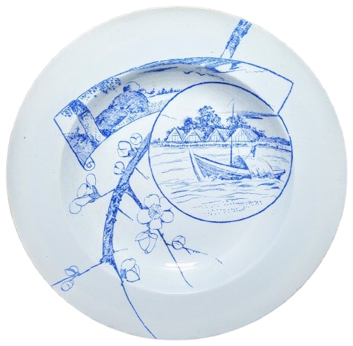 Soup plate, 9.5 inches diameter. Blue transfer. Printed and impressed maker's marks for Brown-Westhead, Moore & Co. The impressed registry diamond indicates a manufacture date of 23 January 1875. "Burmese" is a series of patterns characterized by cartouches filled with copies of Japanese art, especially woodblock prints. Here two cartouches, a horizontal scroll and a circle, are laid over a blooming prunus branch. The circular cartouche features an image of a figure propelling a sampan with a long pole across the water, with a row of A-frame houses in the background on the shore. The scroll cartouche features a man lying prone on the grass by a tree, while smoking a pipe while he gazes up at birds flying above.
