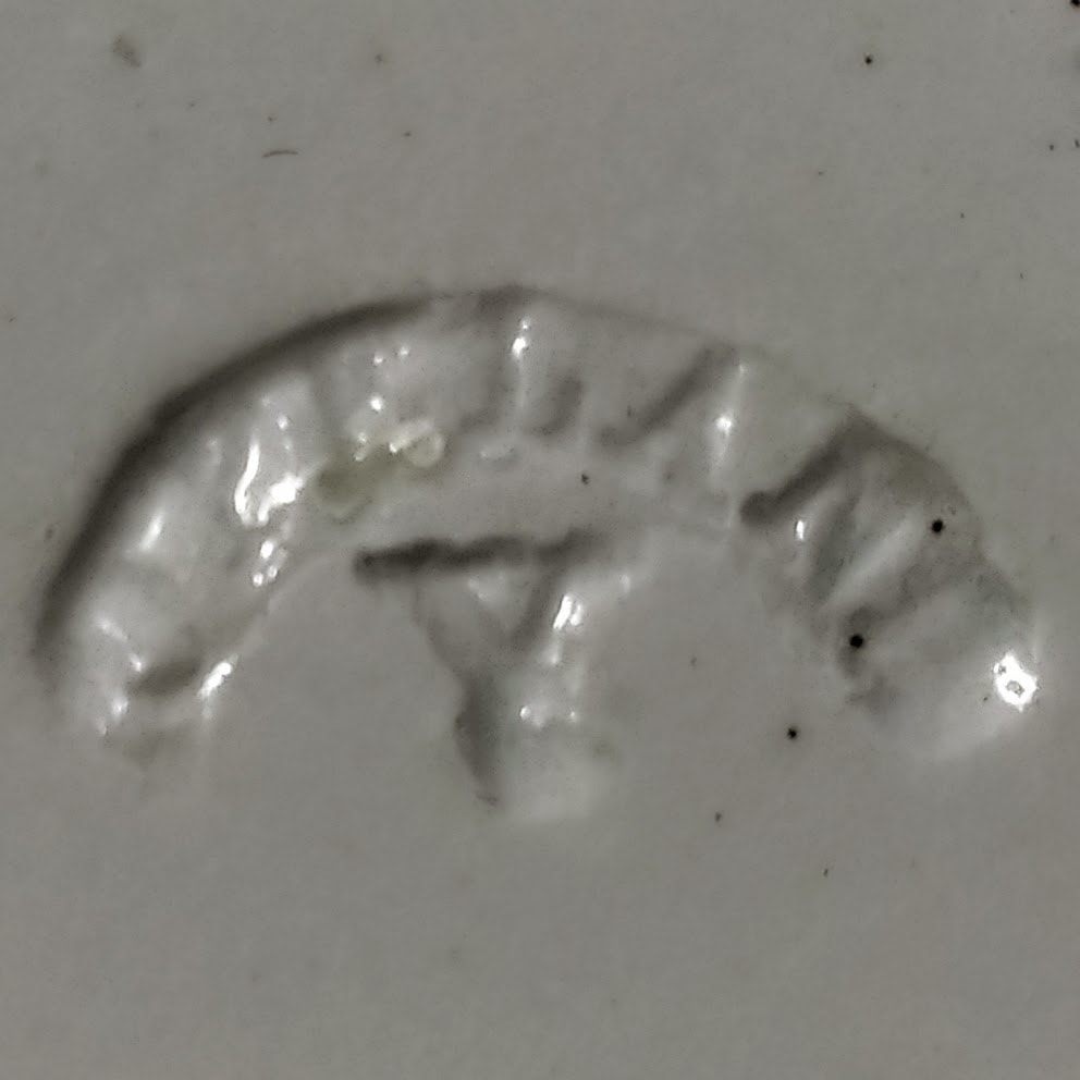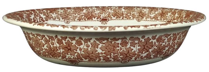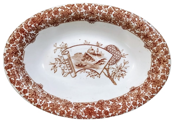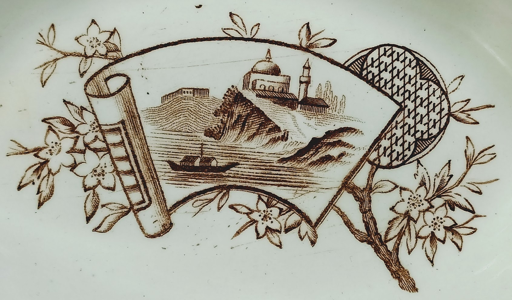 Dish, 6 x 4 x 2.5 inches. Brown transfer. Printed and impressed maker's marks for W. T. Copeland & Sons. Impressed J83 indicates a manufacture date of January 1883. The "Cairo" series was introduced in 1881 and all the patterns in the series feature the "Arabesque" border. Here the central image features two cartouches superimposed over a branch of blossoms and leaves. The smaller cartouche is a quatrefoil contained within a circle and both are filled with geometric designs. The larger cartouche is fan-shaped with a curling left edge and has an image of a boat on the water at the bottom of a rocky cliff with a domed building and minaret at the top.