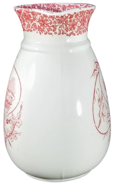 Pitcher, 6.5 inches tall. Red transfer. Maker is W. T. Copeland & Sons. The "Cairo" pattern (no. 2/1796) was introduced in 1881. The border, known as "Arabesque," is seen on all the patterns in this series. Here the central image consists of two large pear-shaped fans. The scene on the front fan is a waterfront with ships at the dock and buildings with minarets behind. The scene on the back fan is of an egret in flight. Both fans are superimposed over a branch of prunus blossoms.