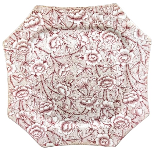 Plate, 9.5 x 9.5 inches. Red transfer. Printed maker's mark for Wallis Gimson & Co. of the Lane Delph Pottery in Fenton, Staffordshire, England. This sheet pattern features leafy stems of camellia blossoms and buds set against a dotted background.