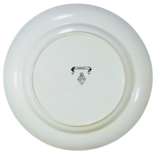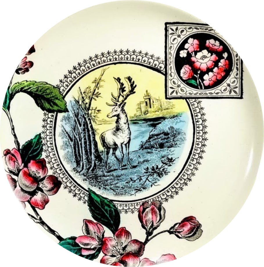 Plate, 9.75 inches diameter. Black transfer with polychrome clobbering and gilding. Maker is Hall & Read. The registry diamond dates the registration of the pattern to 22 February 1883. Three cartouches (one round, one square and one partial square) are found on this plate. The central round cartouche contains a stag with a large rack of antlers in a rural scene with trees and other foliage. The two remaining cartouches are infilled with flowers. All three are surrounded with a lace-like ribbon border. On the left a large branch of blossoms completes the design.