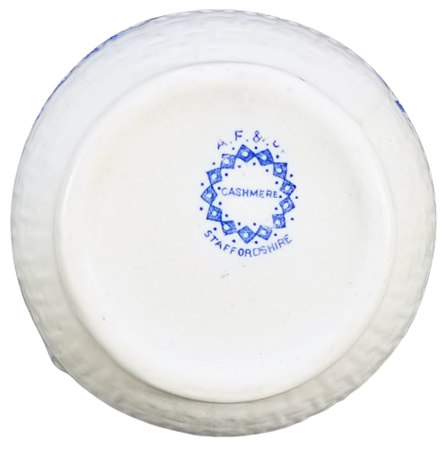 Pitcher, 7 inches tall. Blue transfer. Printed maker's mark for Alfred Fenton & Co. This all-over sheet pattern of flowers and berries has two prominent cartouches at the neck of the pitcher which contain ferns and flowers. The pattern is the same on both sides. The continuous diamond border is found inside the rim and on the handle. This pattern is also known in brown. An identical pattern ("Cashmere") was also used by J.F. Wileman at an earlier date.