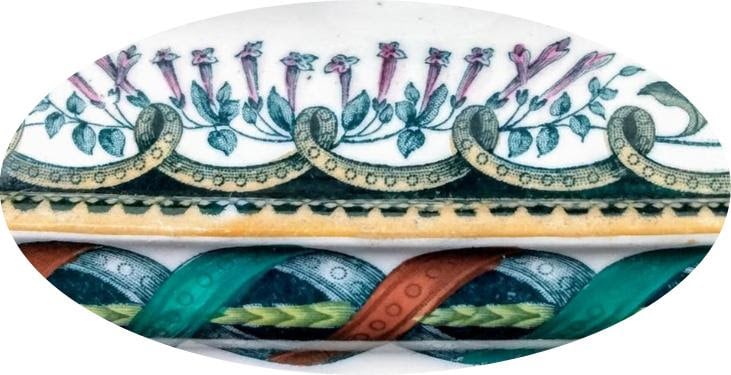 Lidded toiletry box, 8.25 x 3.5 x 2.75 inches (21x8.9x7cm). Black transfer with polychrome clobbering. Printed maker's mark for Cork, Edge & Malkin. This pattern features a delicate floral motif of trumpet flowers and bleeding hearts bordered by a looping ribbon decorated with simple circles. This ribbon is repeated around the body where two twine around each other in a double helix around a repeated chevron pattern. The border around the rim of the body consists of simple geometric shapes and stylized leaves repeated.