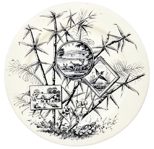 Plate, 8.5 inches diameter. Black transfer. Printed maker's mark for J. H. Davis. The registry diamond dates the registration of this pattern to 15 February 1883. This pattern clearly reflects the Japanese influence of the Aesthetic Movement in England. The background of bamboo stalks are arranged asymmetrically as is typical in Japanese floral arrangements. Superimposed on this background are three different cartouches. The circular cartouche features deer in a park with a grand manor house, perhaps Chatsworth, in the background. The diamond cartouche features a hummingbird in flight above a pond with a waterlily and pad. The square cartouche features a cottage surrounded by trees with two children playing out front.