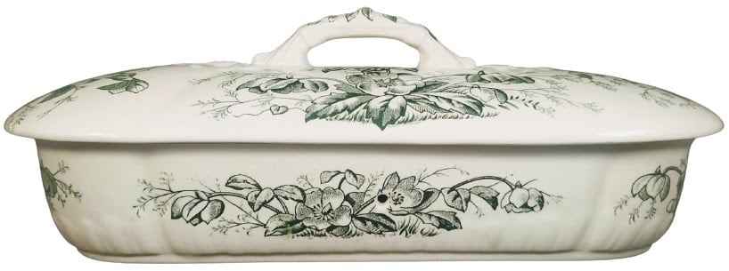 Lidded toiletry box, 9 x 3.25 x 2.5 inches. Printed maker's mark for Wedgwood & Co. This lidded dish was originally part of a toilet service, which was a set of objects used at the dressing table. The pattern features bunches of the eponymous Christmas roses, evenly spaced around the body and lid of the dish.