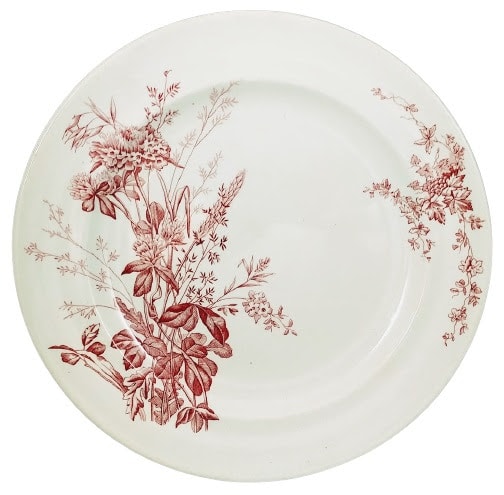 Plate, red transfer. Printed maker's mark for Burgess & Leigh. This pattern is one in a series by Burgess and Leigh which incorporates combinations of the same wildflowers: stalks of caspia, oat grass or meadow barley, and double-daisy shaped strawflowers on long stems mingled with lower growing clumps of flowering clover.