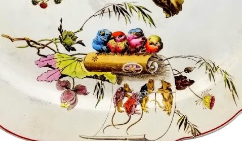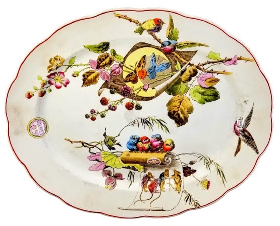 Platter, 18x15 inches. Black transfer with polychrome clobbering. Star mark of Powell, Bishop & Stonier. The diamond registry mark is for 6 December 1880, the date P. B. & S. registered this printed design. The painted number A/950 is the pattern number. This whimsical pattern has four different elements. At the top a curving blackberry branch with berries and flowers pierces a scroll. Two butterflies in flight are superimposed over the pierced scroll and above, two songbirds perch on the blackberry branch. At the bottom a flowering branch and grasses are placed behind a vertical scroll decorated with stylized flowers. Four songbirds sit perched together on the scroll and below, the unfurled part of the scroll features four mice gathered together dressed in Japanese-design printed clothes. At the left is a geometric Japanese mon and at the right is a songbird in flight.