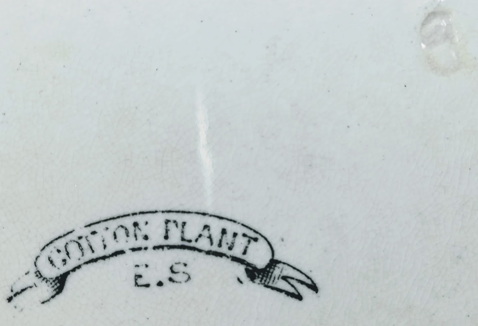 Plate, black transfer. This simple pattern features the eponymous cotton plant with blooms curving around the right side of the plate. A small winged insect hovers over the full cotton bloom. The left side of the plate features a segmented palm-like plant. "Cotton Plant" is very similar in style to the New Wharf Pottery Co. pattern "The Cotton Plant." The E. S. of the printed mark is currently unknown. The initials E. S. could possibly stand for E. Swann, who was in business c. 1887-1892 or Edward Steele of the Cannon Works in Hanley, c. 1875-1900.